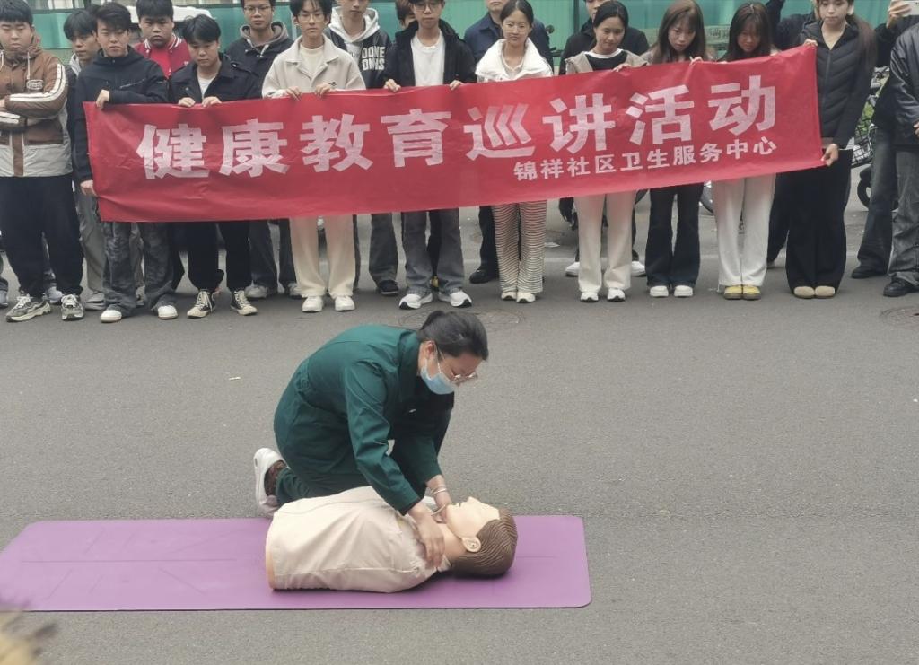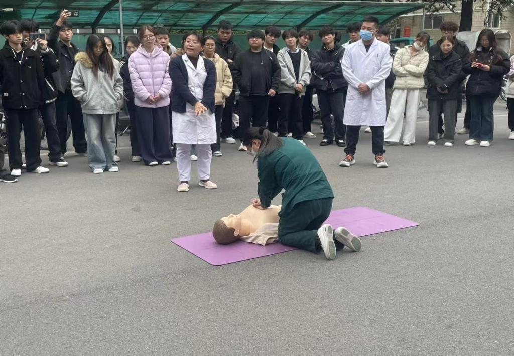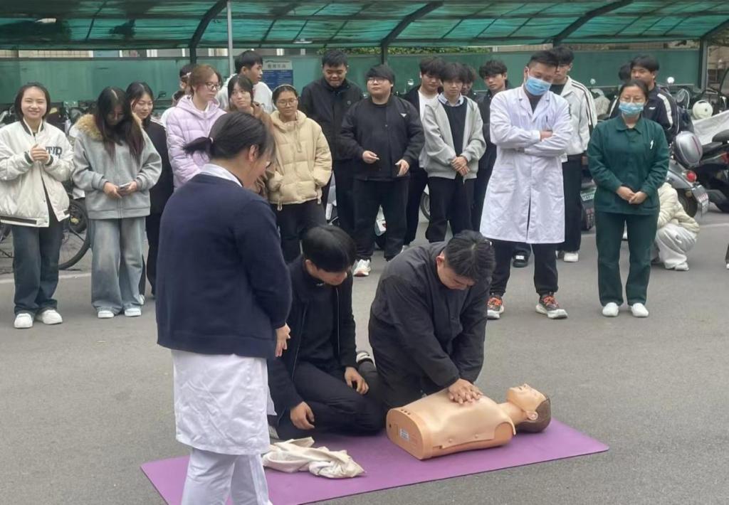 活动中,医护人员以校园常见急救场景为切入,讲解意外摔倒、异物卡喉等突发情况的危害及心肺复苏、海姆立克急救法等技巧,我院两名学生在医护人员的指导下进行实操心肺复苏。