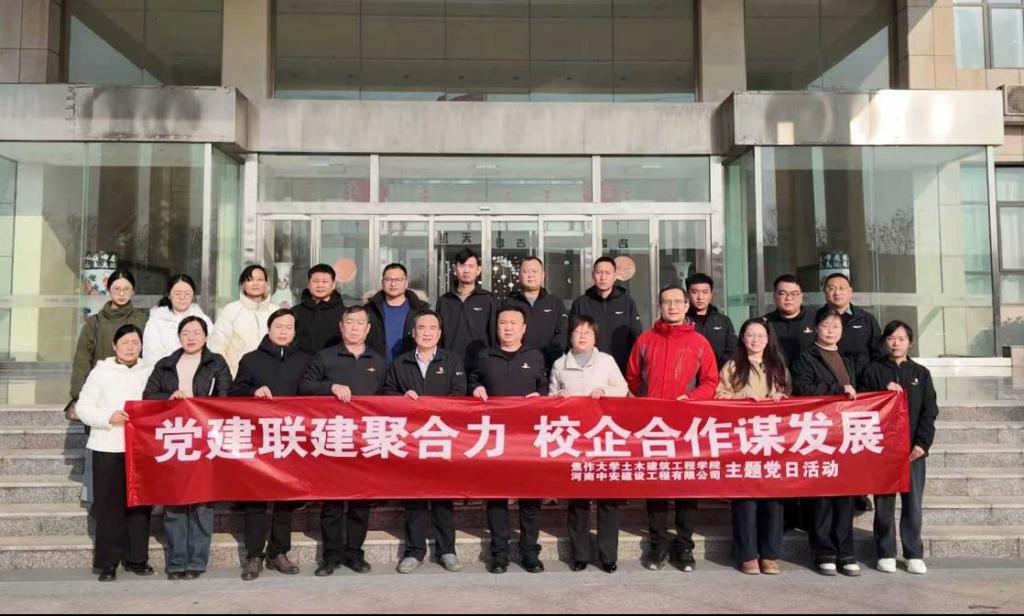 为深入贯彻落实党建引领产教融合发展理念,进一步深化校企合作、实现资源共享与优势互补,12月11日上午9点,yl23455永利集团党总支书记刘文莉、院长李志阳带领学院领导班子成员、教研室主任、实验室主任及党员代表一行,赴河南中安建设工程有限公司开展校企联建党支部主题党日活动。河南中安建设工程有限公司董事长张兆新,党总支书记、总经理杨小明,党总支副书记、副总经理、工会主席梁保国,总助、支委杨阳阳,支委、机关书记康伟,支委、九处书记梁艳红及企业其他党员、积极分子代表热情接待并参与活动。
