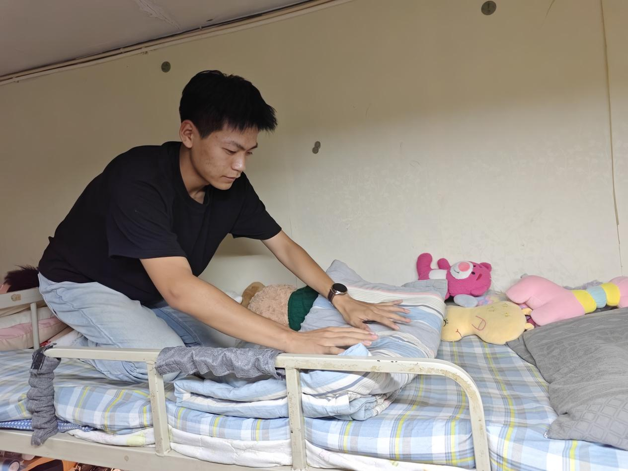 在示范宿舍现场,土木工程专业大二学生崔浩然化身“生活工程师”,演示床铺整理:“被子长边需与床沿保持 90° 垂直,如同建筑墙体的垂直度检测。” 他将叠被过程拆解为 “铺平—压实—折叠—整” 四道工序,每道工序配有 “操作要点”讲解,|“整型环节如同混凝土构件的表面收光,需注重棱角的线条挺拔”。